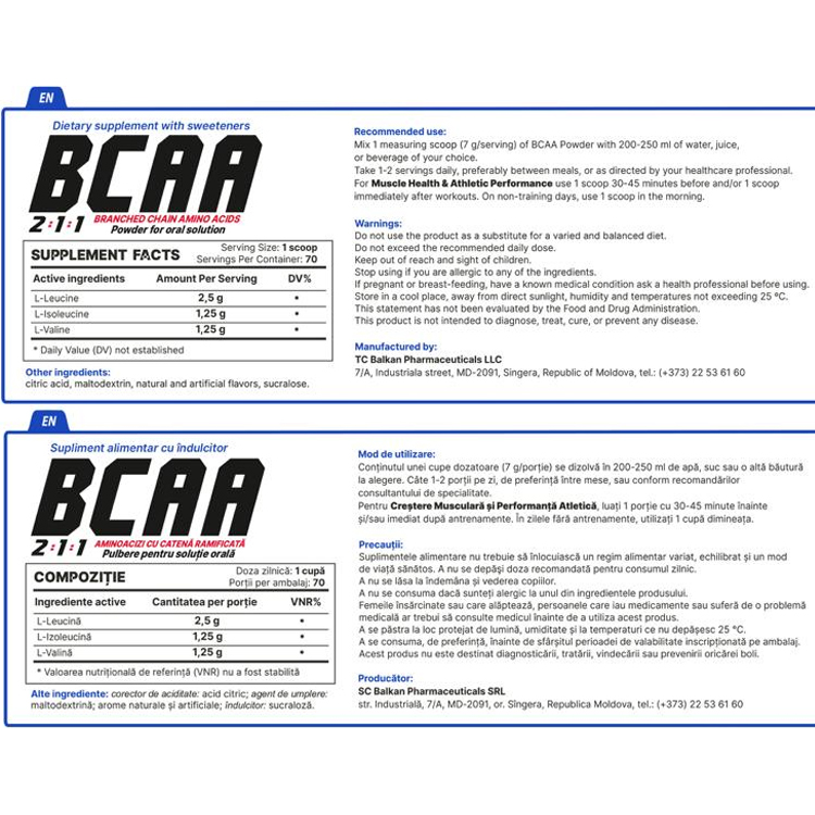 Subcategorie Alimentara Sportiva Directia Echipament Categoria Sport Fitness Denumire model BCAA powder N1 500gr Tara de origine Moldova Grupa Aminoacizi Tipul Aminoacizi Marca comerciala Balkan Pharmaceuticals Model BF1251 -