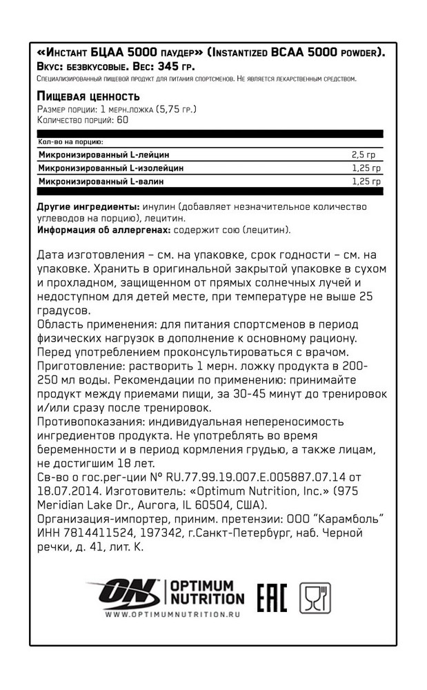 - Аминокислоты Optimum Nutrition ON MICRONZD INSTANT BCAA PWDR UNFLV 345G